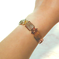 ルチルクオーツを平面にカットした 大ぶりな石のブレスとイヤリングです。 グリーン、オレンジ、ブルーのグラデーションが、 服を選ばずおしゃれに見えることでしょう。 + |
