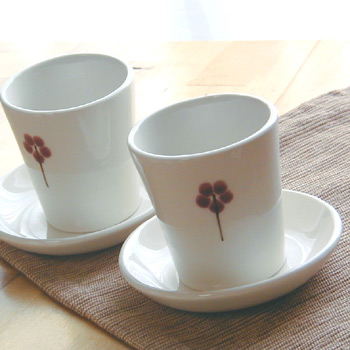 赤いハンドペイントの入ったカップ&トレイ。