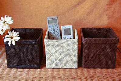 パンダンと呼ばれる植物の繊維を編みそれを芯材に貼り付けたボックスです。