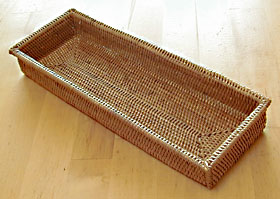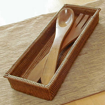 自然な風合いと高級感のある、カトラリートレーです。 わが家のサラダサーバー用のスプーンやフォークも納まる大きめなサイズ。 キッチン以外でもデスク横のペンや時計などを入れたりも…。 ※写真のスプーンやフォークは商品に含まれません。 ※独特の香りは防虫のためスモークしてあるためで自然になくなります。 ※手作りのため編み方や形などは均一ではない場合があります。 |