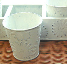 花のレリーフが入ったブリキにホワイトペイントを施した台に、