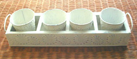 同じ仕様のカップが4つ入った、キュートな雑貨です。 花や小物を入れるだけでちょっとしたオブジェに…。 ガーデニングにも使えるかも…。 ※形はいびつなところも少々あり、ペイントもかなりムラはありますが、 ナチュラル感を出すためですのでご了承くださいませ。 |